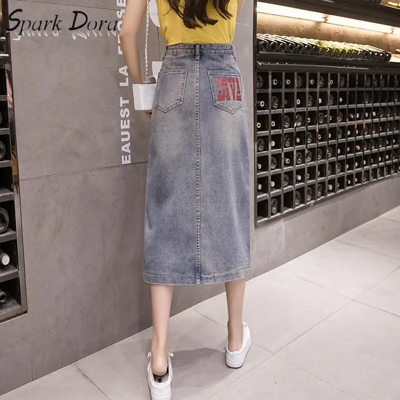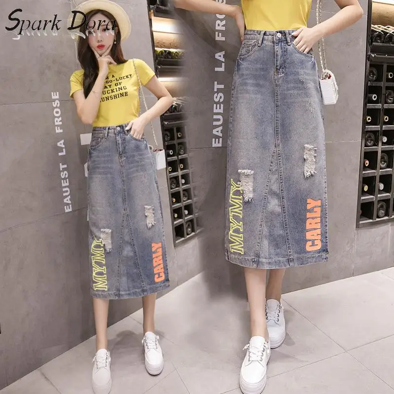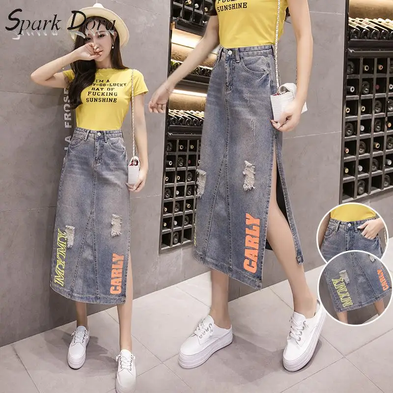 Promo SparkDora 2020 Spring And Autumn New Ripped Denim Skirt Mid Length Korean High Waist Color Letter Split Denim Skirt